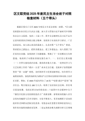 区文联党组书记2025年度民主生活会个人对照检查材料(五个带头)按照区委关于召开2025年度民主生活会的统一部署和要求,本人紧扣会议主题,在深入开展理论学习的基础上,通过多种形式广泛征求意见建议,并与班子成员、分管领域同志深入开展谈心谈话。在此基础上,我严格对照“五个带头”的具体要求,深入查摆自身存在的差距和不足,深刻剖析问题根源,明确了今后的努力方向和整改措施。现将个人对照检查情况报告如下。一、存在的主要问题(一)在带头强化政治忠诚、提高政治能力方面。一是理论武装与实践转化存在温差。尽管能够按时参加党组理论学习中心组的各项学习安排,特别是对党的二十届三中、四中全会精神等重要内容进行了系统学习...