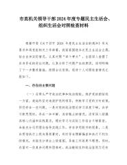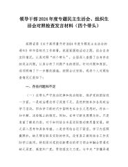 领导干部2024年度专题民主生活会、组织生活会对照检查发言材料(四个带头)按照省委《关于高质量开好2024年度专题民主生活会的通知》和市委相关工作部署,我紧紧围绕活动主题,结合自身实际情况,认真对照“四个带头”,全面深入查摆了自身存在的突出问题,认真分析了问题产生的原因,针对问题和原因,逐项明确了下一步整改措施。按照会议安排,现将个人对照检查情况汇报如下:一、存在问题和不足(一)在带头严守政治纪律和政治规矩、维护党的团结统一方面。一是政治理论学习深度不足。虽然积极参加各类政治学习活动,但在学习新时代中国特色社会主义思想时,存在一知半解、浅尝辄止的情况。例如,在学习新发展理念时,只是表面了解其内...