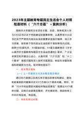2023年主题教育专题民主生活会个人对照检查材料(“六个方面”+案例分析)围绕本次专题民主生活会主题,会前,我系统深入学习XXX总书记关于党的建设的重要思想,认真贯彻XXX总书记关于严肃党内政治生活的重要讲话指示精神,深入学习党章、新形势下党内政治生活的若干准则等党内法规。按照XX纪委机关、XX委组织部、XX委主题教育办《关于认真开好主题教育专题民主生活会的通知》要求,广泛征求意见和开展交心谈心,认真对照“六个方面”和“十二个要求”查摆问题和深入剖析问题原因,制定科学整改措施和明确努力方向。现对照检查如下:一、有关情况报告(一)上一年度民主生活会整改落实情况通过自己查摆以及各位同志提出的意见和...