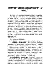 2021年党史学习教育专题民主生活会对照检查材料(五个带头)根据省委《关于开好党史学习教育专题民主生活会的通知》要求,市委拟定于2022年x月x日召开市委常委党史学习教育专题民主生活会。这次民主生活会的主题是,大力弘扬伟大建党精神,坚持和发展党的百年奋斗历史经验,坚定历史自信,践行时代使命,厚植为民情怀,勇于担当作为,团结带领人民群众走好新的赶考之路。会前,市委对照此次民主生活会主题,在开展学习教育、广泛征求意见建议、深入开展谈心谈话的基础上,认真对照“五个方面”内容,深刻查摆检视,深挖问题根源,明确整改措施。现将有关情况汇报如下:一、专题民主生活会准备情况一是高度重视,精心安排部署。市委常委...