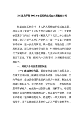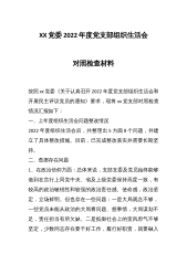 XX党工委办公室党支部班子202X年度组织生活会对照检查材料按照**党工委组织部关于召开2022年度组织生活会的通知要求,**党支部组织全体党员认真学习了党的二十大报告及xxx总书记系列讲话精神,对照党章规定的党支部职责,对照落实党中央、省委、市委和**党工委部署要求,对照党史学习教育、巡视巡察、重大腐败案件警示教育等专题组织生活会问题整改情况,紧密联系工作实际,深入查摆党支部工作存在的不足,并深刻剖析问题产生的根源,提出了下一步整改落实的方向和措施。现将对照检查情况报告如下:一、存在的主要问题(一)增强政治功能方面一是“两个确立”的理论宣传有差距。对党员干部的理论宣传不够系统、全面、深刻,宣...