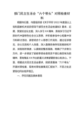 部门民主生活会“六个带头”对照检查材料根据市纪委、市委组织部《关于开好2022年度县以上党和国家机关党员领导干部民主生活会的通知》要求,近期,我紧扣会议主题,深入学习XX精神,系统学习习近平新时代中国特色社会主义思想,并积极参加中心组集中学习和研讨活动,紧密结合个人思想工作实际,通过征求意见、谈心交流和个人自查,深入查摆自身存在的差距和不足,深刻剖析根源,认真制定整改措施,明确了下步努力方向,进一步坚定了团结带领全县党员干部以奋发有为的精神,贯彻落实XX作出的重大决策部署的信心和决心。下面,根据此次民主生活会要求,我紧紧围绕“六个带头”开展对照检查,现将对照检查情况汇报如下,不妥之处还望各位同...