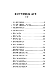 重阳节讲话稿汇编(20篇)目录1.学生重阳节讲话稿...........................................32.学校领导在重阳节上的讲话稿............................63.学校重阳节讲话稿1.......................................114.学校重阳节讲话稿2.......................................145.重阳节讲话稿1.............................................176.重阳节讲话稿2.....................