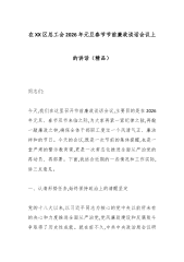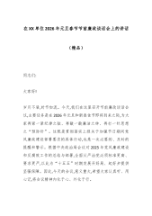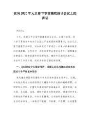 在XX区总工会2026年元旦春节节前廉政谈话会议上的讲话(精品)同志们:今天,我们在这里召开节前廉政谈话会议,主要目的是在2026年元旦、春节双节来临之际,为大家再紧一紧纪律之弦,再敲一敲廉政之钟,确保全体干部职工度过一个风清气正、廉洁祥和的节日。今天的会议,既是一次节前的集体提醒,也是一堂严肃的警示教育课,更是一次常态化推进全面从严治党的再动员、再部署。下面,我结合近期的一些情况和工作实际,讲三点意见。一、认清形势任务,始终保持政治上的清醒坚定党的十八大以来,以习近平同志为核心的党中央以前所未有的决心和力度推进全面从严治党,党风廉政建设和反腐败斗争取得了历史性成就。就在前不久,中共中央政治局...
