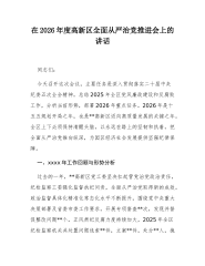 人大常委会主任在2026年落实全面从严治党暨党风廉政建设工作会议上的讲话同志们:今天,县人大常委会召开2026年落实全面从严治党暨党风廉政建设工作会议,主要任务是深入学习贯彻总书记在二十届中央纪委五次全会上的重要讲话精神,全面落实二十届中央纪委五次全会以及十二届省、市、县纪委全会精神,回顾总结2025年全面从严治党和党风廉政建设工作,分析当前形势,研究部署2026年重点任务,动员全体干部职工以更高的站位、更严的标准、更实的作风,推动全面从严治党向纵深发展,为开创人大工作新局面提供坚强政治保证。一、充分肯定2025年工作成效,切实增强推进全面从严治党的信心决心2025年是“十四五”规划收官之年,...