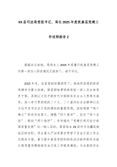 XX公司党委书记在2025年度党(总)支部书记述职评议会上的讲话(精品)同志们:今天我们召开X公司2025年度党(总)支部书记述职评议会,主要目的是通过“述、问、评、测”的方式,全面检验过去一年各党(总)支部书记抓党建工作的成效与不足,进一步压紧压实基层党建责任,确保全面从严治党要求在公司落地生根。刚才,各位书记紧扣年度党建重点任务,实事求是地汇报了履职情况,坦诚剖析了问题短板,明确了改进方向。大家的述职准备充分,内容实在,既展示了成绩亮点,也反映了差距不足。相互点评环节,同志们开门见山,交流了经验,凝聚了共识。总体来看,这次会议开得很成功,达到了预期效果,是一次对全年党建工作的“集中检阅”,...