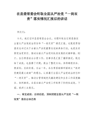 2025年度县委副书记履行党建和党风廉政建设“一岗双责”工作情况汇报材料2025年是全面贯彻党的二十届四中全会精神的开局之年,也是纵深推进全面从严治党的关键一年。一年来,本人始终坚持以习近平新时代中国特色社会主义思想为指导,深入学习贯彻党的二十届四中全会精神,认真落实新时代党的建设总要求和新时代党的组织路线,切实履行党建和党风廉政建设"一岗双责",以高质量党建引领高质量发展,以严的基调推进党风廉政建设,为全县经济社会发展提供了坚强政治保证。现将一年来履职情况汇报如下。一、强化政治引领,把牢正确方向一是坚定政治立场。全年参加县委理论学习中心组学习共*次,专题学习习近平总书记关于党的建设、党风廉政...