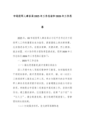 市退役军人事务局2025年工作总结和2026年工作思路 2025年,XX市退役军人事务局以习近平总书记关于退役军人工作的重要论述为指导,紧紧围绕上级决策部署,扎实推进各项工作,在服务保障、双拥共建、烈士褒扬、就业安置、对口协作等方面取得显著成效。现将2025年工作总结及2026年工作思路汇报如下: 一、2025年工作总结 (一)强化思想教育,提升党建引领活力 深入开展中央八项规定精神学习教育,切实锤炼党员干部党性修养,提升思想觉悟。组织市、镇、村(社区)三级退役军人服务站工作人员,举办为期两天的全市退役军人事务系统素质提升培训班,全面增强业务能力与综合素质。积极配合市委第二巡察组开展巡...