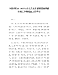 市委书记在2025年全市党建引领基层高效能治理工作推进会上的讲话同志们:今天,我们再次召开全市党建引领基层高效能治理工作推进会。之所以如此密集地召开会议,目的十分明确,就是要传递一种决心、一种态度、一种导向:党建引领基层高效能治理这项工作,是当前和今后一个时期全市工作的重中之重,必须以“等不起”的紧迫感、“慢不得”的危机感、“坐不住”的责任感,持续加压、聚力推进。在上次会议上,市委组织部汇报了“五基四化”的深化方案,11家牵头单位汇报了xx个专项行动的初步设想。会议明确了思想、凝聚了共识、部署了任务。这几天,各级各部门闻令而动,展现出了一定的执行力。但是,动起来不等于动得好,有部署不等于有落实...