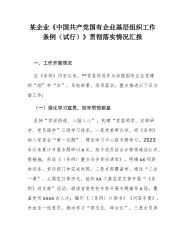 某企业《中国共产党国有企业基层组织工作条例(试行)》贯彻落实情况汇报一、工作开展情况自《条例》印发以来,**党委将其作为加强国有企业党建的“纲”和“本”,系统部署、逐项落实,重点推进以下五方面工作:(一)强化学习宣贯,筑牢思想根基坚持“学深悟透、入脑入心”,构建“党委领学、支部研学、党员践学”三级学习体系。一是党委带头学。将《条例》纳入党委会“第一议题”、理论学习中心组专题学习,2023年以来累计开展专题研讨x次,班子成员结合分管领域谈认识、提措施,形成《〈条例〉重点任务责任清单》,明确xx项具体任务、责任部门和完成时限。二是支部覆盖学。通过“三会一课”、主题党日等形式,组织xx个基层党支部开...