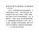 公共课教学部党总支书记2022年抓基层党建工作述职报告2022年,在学校党委的带领下,公共课教学部党总支以习近平新时代中国特色社会主义思想为指导,从学校“双高建设”等重点工作任务出发,建设勇于担当、服务奉献、党建与业务互融互促的基层党组织,强化党建工作对教学科研的引领作用,抓住教师队伍“主力军”、课程建设“主战场”、课堂教学“主渠道”,促进学生德智体美劳全面发展,各项工作取得一定进展。现对2022年度公共课教学部党总支基层党建工作情况进行汇报。第一部分,年度工作成效(一)严抓基层党组织建设,旗帜鲜明讲政治1.增强党组织影响力号召力,党的领导全面覆盖本年度召开支委会12次,党员大会6次,党课活动...