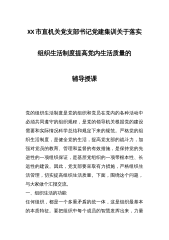 XX市直机关党支部书记党建集训关于落实组织生活制度提高党内生活质量的辅导授课党的组织生活制度是党的组织和党员在党内的各种活动中必须共同遵守的组织规程,是党的领导机关根据党的建设需要和实际情况科学总结和规定下来的规范。严格党的组织生活制度,是健全党的生活,提高党支部的战斗力,加强对党员的教育、管理和监督的有效措施,是保持党的先进性的一项组织保证,是基层党组织的一项带根本性、长远性的建设。因此,党支部要采取有力措施,严格组织生活管理,切实提高组织生活质量。下面,围绕这个问题,与大家做个汇报交流。一、组织生活的功能任何组织,都是一个多重矛盾的统一体,这是组织最基本的本质特征。要把组织中每个成员的智慧...