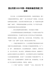 国企党组2025年上半年党建工作总结及下一步工作打算今年以来,公司党组坚持坚持以习近平新时代中国特色社会主义思想为指导,全面落实党的二十大及二十届三中全会精神,锚定新时代国企党建新坐标,以“全面从严深度融合、系统提升”为工作主线,坚持“五个聚焦”工作法,构建形成“责任明确、基础扎实、机制健全、品牌突出、队伍过硬”的党建工作新格局,为企业高质量发展注入强劲动能。一、主要工作情况(一)聚焦责任链条立体化,构建闭环式党建责任体系。党组牢牢抓住责任制这个牛鼻子,创新构建三维立体责任传导机制,推动党建工作从软指标变为硬约束。一是建立“三单两书”责任清单机制。分级制定党组班子、党组书记、班子成员三张责任清...