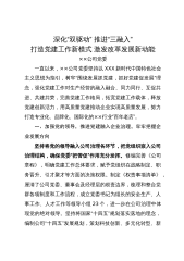 深化“双驱动”推进“三融入”打造党建工作新模式激发改革发展新动能××公司党委一直以来,××公司党委坚持以XXX新时代中国特色社会主义思想为指引,树牢“围绕发展抓党建,抓好党建促发展”理念,强化党建工作对生产经营的融入融合、同力同行、互促共进、共建共荣,完善党建工作格局,拓宽党建工作载体,释放党建创新活力,用高质量党建推动企业实现高质量发展,努力打造专业化、品牌化、国际化的××行业“百年老店”。一、加强党的领导,推进党建融入企业治理,牢牢把握企业发展方向坚持将党的领导融入公司治理各环节,把党组织嵌入公司治理结构,确保党委“把管促”作用充分发挥。修编完善《公司章程》,明确党建工作总体要求,赋予党组...