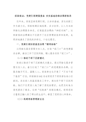 党建引领基层治理工作经验交流发言材料汇编(10篇)目录1.党建引领促发展强基固本筑堡垒2.“三创新三做强”服务保障高质量发展3.持续深化“党建+”引领打好基层治理“精准牌”4.扣紧年轻干部“成长链”厚植成长成才沃土5.多点发力锻造乡村振兴“硬核队伍”6.“xxx”工作法推动党建“三基本”与“三基”工作有机融合7.抓实“全企一体”推动“双融共促”8.四步“廉”动上好党员干部廉政必修课9.以品牌树形象以党建促发展10.坚持党建引领,打造“新动能方程”党建引领促发展强基固本筑堡垒一个支部就是一座堡垒,一名党员就是一面旗帜。社区治理工作面临的是上上下下“千条线”,社区党建工作是穿起“千条线”的“一根针...