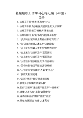基层组织工作学习心得汇编(49篇)目录1.@组工干部“功夫”不负有“心”人2.@组工干部为乡村振兴提供坚实“人才保障”3.@组工干部组工“特种兵”请求出战4.@组织部门执“笔”书写“满分组工答卷”5.“步步到位”把专项党费资金用到“刀刃上”6.“点”上发力绘就人才工作“上扬曲线”7.“点上发力”巧解人才工作“高阶方程式”8.“点上发力”让组织工作“层层开花”9.“点上发力”让组织工作“面面开花”10.“人才活水”载乡村振兴“舟”稳步前行11.“三个转变”做优干部培训“供给侧”12.“三字诀”让党员教育“入脑”更“入心”13.“实而又实”抓党建14.“正冠”“理衣”“量实”阔步新征程15.搭牢人...