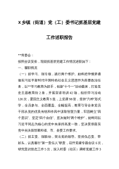X乡镇(街道)党(工)委书记抓基层党建工作述职报告**常委会:按照会议安排,现就抓基层党建工作情况述职如下:一、履职情况(一)抓学习、强引领,践行两个维护。始终把学懂弄通做实习近平新时代中国特色社会主义思想作为首要政治任务,以**学习教育为抓手,创新“十个一”活动载体,打造党史主题教育街2条,开展宣讲培训42场,组织学习活动126次,爱国主义教育5批,上党课98堂,坚持“六种”形式学,全员参与、全面覆盖、全幅提高,教育引导全体党员干部从党的优良传统和作风中汲取智慧力量,牢固树立“四个意识”、坚定“四个自信”、坚决做到“两个维护”,始终同以习近平同志为核心的党中央保持高度一致,坚决贯彻落实党中央...
