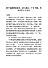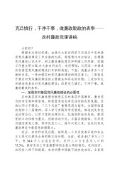 克己慎行,干净干事,做廉政勤政的表率——农村廉政党课讲稿大家好!根据本次培训安排,由我与大家共同学习交流关于农村基层党风廉政建设工作方面的内容,希望通过本次培训,在增强党风廉政认识水平、树立勤政廉政意识和明晰工作思路、把握工作重点等方面,对大家有所启示、有所帮助,从而进一步推进农村基层党风廉政建设打开新的局面。下面,我重点讲五个方面的内容,一是加强农村党风廉政建设的现实意义;二是我县开展农村党风廉政建设的主要做法和存在的问题;三是如何扎实推进我县农村党风廉政建设;四是克己慎行,干净干事,做廉政勤政的表率。一、加强农村基层党风廉政建设的必要性农村基层党风廉政建设就是在农村基层开展教育,激发党员的...