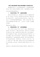 党员干部纪检监察干部队伍教育整顿工作推进会发言教育整顿开展以来,中央纪委国家监委第十二审查调查室按照委机关统一部署,紧密结合审查调查工作实际,以教育整顿促工作深化,以执纪成果检验教育整顿成效。一、传达学习突出“早”,迅速动员部署。委机关动员部署会议后,立即组织学习XXX总书记重要批示精神。第一时间成立工作专班,研究制定室内具体方案,明确33项具体任务和责任人。室党支部书记赶赴全部谈话点、外查点开展一线动员,面对面把教育整顿的重要性、必要性、紧迫性讲透。组织全体在编和借调干部开展大讨论,人人谈认识、谈打算,切实增强参加教育整顿的责任感、使命感。二、教育培训突出“全”,夯实思想根基。突出一体协同,...