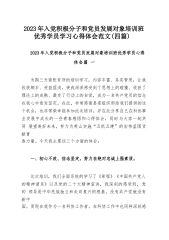 2023年入党积极分子和党员发展对象培训班优秀学员学习心得体会范文(四篇)2023年入党积极分子和党员发展对象培训班优秀学员心得体会篇一为期三天紧张有序的培训学习,内容丰富、务实管用,让我收获颇丰、受益匪浅,使我深深感受到了思想上的碰撞、收获了理论上的成熟、激发了行动上的自觉,成为一名共产党员的信念在我心中愈发坚定。在此,非常感谢县委组织部给我们提供的这个机会,也非常荣幸能参加此次培训,并在此分享自己在科协事业发展中成长的一些青春感悟和心得体会,同时与大家一起共同展望美好未来,努力为英山实施“五抓五建”的宏伟蓝图贡献青春力量。今天我主要谈三个方面的体会:一、初心不改、信念坚定,努力在绝对忠诚上...