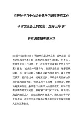 在理论学习中心组专题学习调查研究工作研讨交流会上的发言:念好“三字诀”夯实调查研究基本功xxx总书记深刻指出:“调查研究是谋事之基、成事之道,没有调查就没有发言权,没有调查就没有决策权。”前不久,中共中央办公厅印发《关于在全党大兴调查研究的工作方案》提出:“必须坚持问题导向,增强问题意识,敢于正视问题、善于发现问题,以解决问题为根本目的,真正把情况摸清、把问题找准、把对策提实,不断提出真正解决问题的新思路新办法。”基层工作千头万绪、繁琐复杂,要解决好实际问题,必须进行全面深入的调查研究。年轻干部要以调查研究为契机,用好“精”“准”“实”三字诀,锻造绝对忠诚的政治品格、练就过硬的本领水平、淬炼踏...