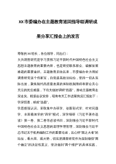 XX市委编办在主题教育巡回指导组调研成果分享汇报会上的发言尊敬的XX组长,各位领导,同志们:大兴调查研究是学习贯彻习近平新时代中国特色社会主义思想主题教育的重要内容,也是密切联系群众、破解发展难题的重要途径。主题教育启动以来,市委编办全力用好调查研究这个传家宝,自觉提高政治站位,坚持一切从实际出发,聚焦制约高质量发展的体制机制障碍和群众关心关注的民生难题,下功夫做好调研“四题”,推动主题教育走深走实。根据会议安排,现将有关工作进展情况汇报如下:学深悟透,精准“选题”。学思想强认识。采取集中办班学、创新形式学、针对问题学、丰富载体学的“四学”模式,深学细研《习近平著作选读》第一卷、第二卷等必读书...