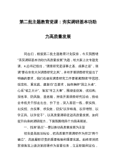 第二批主题教育专题党课:以高质量调查研究助推主题教育走深走实同志们:调查研究是我们党的传家宝,是做好各项工作的基本功。习近平总书记在主持二十届中央政治局第四次集体学习时强调,“要带头抓好调查研究,深入实际、深入群众,增强问题意识,真正把情况摸清、把问题找准、把对策提实,提出解决问题的新思路新办法,引导和推动全党大兴调查研究之风”。在全党大兴调查研究之风,重在从党的历史中汲取精神滋养,以强化理论学习指导发展实践,以深化调查研究推动解决发展难题,以推动高质量发展的新成效检验主题教育成果。借此机会,由我为大家交流交流我对调查研究的几点想法。一、提高站位,将调查研究传家宝传承好、发扬好调查研究是贯穿我...
