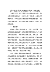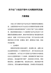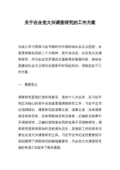 关于在全市各级党组织和广大党员干部中大兴调查研究的实施方案为深入学习贯彻习近平新时代中国特色社会主义思想,全面贯彻党中央关于在全党大兴调查研究的重要部署,动员组织全市各级党组织和广大党员干部广泛深入调查研究,更好落实党的二十大精神和习近平总书记对江苏工作重要讲话重要指示精神,推动中国式现代化宿迁新实践开好局起好步,根据《中共中央办公厅印发〈关于在全党大兴调查研究的工作方案〉的通知》和《中共江苏省委办公厅印发〈关于在全省各级党组织和广大党员干部中大兴调查研究的实施方案〉的通知》要求,紧密结合宿迁实际,制定本实施方案。一、总体要求坚持以习近平新时代中国特色社会主义思想为指导,深入学习习近平总书记关...
