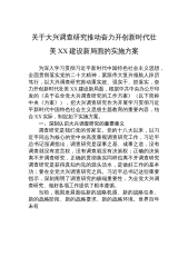 关于大兴调查研究推动奋力开创新时代壮美XX建设新局面的实施方案为深入学习贯彻习近平新时代中国特色社会主义思想,全面贯彻落实党的二十大精神,紧跟伟大复兴领航人踔厉笃行,以大兴调查研究推动重实效、强实干、抓落实,奋力开创新时代壮美XX建设新局面,根据中共中央办公厅印发的《关于在全党大兴调查研究的工作方案》(以下简称中央《方案》),把大兴调查研究作为开展学习贯彻习近平新时代中国特色社会主义思想主题教育的重要内容,结合XX实际,制定如下实施方案。一、深刻认识大兴调查研究的重要意义调查研究是我们党的传家宝。党的十八大以来,以习近平同志为核心的党中央高度重视调查研究工作,习近平总书记强调指出,调查研究是谋...