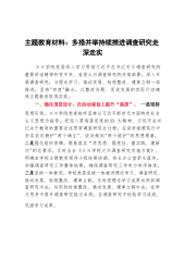 【11篇】主题教育研讨发言材料、动员会发言、活动方案第1篇心得感悟(交流发言):某某单位中心组2023年集体学习主题教育主题教育心得体会——"一以贯之"让调研“甘霖”润泽基层“原野”近日,中共中央办公厅印发了《关于在全党大兴调查研究的工作方案》(以下简称《工作方案》),并发出通知,要求各地区各部门结合实际认真贯彻落实。调查研究是谋事之基、成事之道,是做好各项工作的基本功,是我们党的传家宝,在各种大政方针、行动路线的制定中起到了至关重要的作用。作为基层干部要涵养“一根杆子插到底”的精神,强化“一把尺子量到底”的意识,拿出“一根钉子钉到底”的决心,在广袤基层大地上做绝对忠诚的"执行者”、起而行之的...
