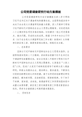 公司党委调查研究行动方案模板公司党委调查研究行动方案模板为深入学习贯彻习近平总书记关于调查研究的重要论述,全面贯彻落实党中央关于在全党大兴调查研究的重大部署,深入开展学习贯彻习近平新时代中国特色社会主义思想主题教育,切实把党的二十大确定的各项任务落实落细,切实解决一批公司发展难点、堵点问题,形成标志性成果,根据《中共中央办公厅印发〈关于在全党大兴调查研究的工作方案〉的通知》文件精神及新区党工委、集团党委相关要求,特制定本方案。一、总体要求坚持以习近平新时代中国特色社会主义思想为指导,全面贯彻落实党的二十大精神,深刻领会把握习近平总书记关于调查研究的重要论述,结合全党深入开展学习贯彻习近平新时代...