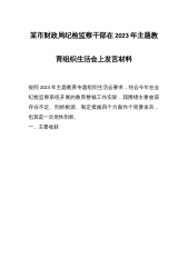 某市财政局纪检监察干部在2023年主题教育组织生活会上发言材料按照2023年主题教育专题组织生活会要求,结合今年在全纪检监察系统开展的教育整顿工作实际,我围绕主要收获存在不足、剖析根源、制定措施四个方面作个简要发言,也算是一次党性剖析。一、主要收获在全党深入开展学习贯彻习近平新时代中国特色社会主义思想主题教育,是党中央因时因势作出的重大决策,鲜明提出了“学思想、强党性、重实践、建新功”的总要求,对理论学习、调查研究、推动发展、检视整改等工作作出重点部署,切实通过学习教育达到以学铸魂、以学增智、以学正风、以学促干。在全纪检监察系统开展的教育整顿,也是把铸就政治忠诚放在首要目标,把学习教育贯穿全程...