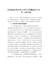 区司法局2024年上半年工作情况及下半年工作计划2024年上半年,我局全面贯彻落实中央和省、市决策部署,贯彻落实区委、区政府工作安排,持续推进法治城区、法治政府、法治社会一体建设,努力打造更高水平法治*。一、2024年上半年工作总结(一)坚持强化统筹,以高站位推动依法治区建设。一是精准推进全面依法治区工作。印发全面依法治区2024年工作要点及重点任务分工表,部署全区重点法治建设任务,推进落地落实。开展法治“深调研”工作,在全区征集选定调研课题,督促指导责任单位深入开展调查研究。推进区党政主要负责人完成上一年度述职述法。加强对基层法治建设工作的统筹指导,推动11个街道提升依法治街委统筹协调机制运...