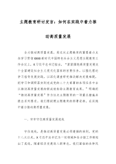 主题教育学习心得牢固树立正确政绩观用实绩交出优异答卷根据党委安排部署,我们围绕“深入学习贯彻习近平总书记关于调查研究、树立和践行正确政绩观”举办专题读书班,通过认真学习习近平总书记关于树立和践行正确政绩观、推动高质量发展的重要论述,我深刻领会到正确政绩观的丰富内涵和实践要求,也深刻理解了“政绩为谁而树树什么样的政绩、靠什么树政绩”这一重大问题。下面,我结合实际,从三个方面谈一下学习体会。一是提高党性修养,以坚定的理想信念确保在思想上的政绩观零偏差讲不讲党性、党性强不强、政绩观正确与否有很多考量因素和评价指标,其中最为重要且起决定性作用的就是理想信念。我们党常常用“钙”“立党兴党之基”“安身立命...