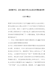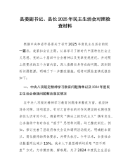 县委副书记、县长2025年民主生活会对照检查材料(五个带头)根据中央和省市县委关于召开2025年度民主生活会的统一要求,我紧扣会议主题,认真学习了习近平新时代中国特色社会主义思想、党的二十届四中全会精神以及党章党规党纪,并对照上级要求的五个方面内容,深入查摆自身存在的问题,深刻剖析问题根源,明确了下一步整改措施。现将对照检查情况报告如下:一、中央八项规定精神学习教育问题清单以及2024年度民主生活会查摆问题整改落实情况在中央八项规定精神学习教育问题清单整改方面,我坚持逐条对照、逐项落实。针对之前存在的对作风建设的长期性复杂性认识有时不足、调查研究“脚尖上的形式主义”偶有发生、公务接待中有时存在...