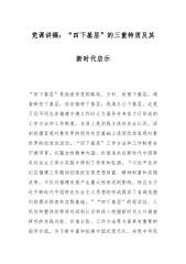 在全市落实“四下基层”交流座谈暨主题教育整改整治工作推进会上的汇报发言 尊敬的各位领导,同志们: 今年以来,我市牢记嘱托,努力奋进,传承弘扬“四下基层”优良传统,落实宣传党的路线、方针、政策在一线,调查研究在一线,信访接待在一线,现场办公在一线持续深化深学细悟、实干担当,不断营造争先创优的良好氛围。现将有关工作进展情况汇报如下: 宣传宣讲“聚共识”。坚持思想教育、理论武装打头组织各级领导干部深入基层开展党的二十大精神、习近平新时代中国特色社会主义思想宣讲,以党内教育引导带动全社会学习,推动党的创新理论“飞入寻常百姓家”。积极探索活动主体和创新载体,充分发挥领导干部示范引领作用,依托“结对...