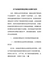 关于加强基层消防监管能力的调研与思考当前,我国社会经济发展迅速,城镇化进程不断加快,不仅是城市中,在县、乡镇和广大农村地区,人口、物资、资源也越来越高度集中于某些特定的区域,给现有的基层消防监管工作带来了新的要求和更大的难度。必须加强调查研究,找准当前基层消防综合监管存在的问题,正确分析做好基层消防综合监管工作面临的新挑战,探索解决基层消防综合监管问题的方法措施,切实有效提升基层消防治理体系和治理能力建设水平,推动城镇化建设、促进经济社会持续发展。一、当前基层消防监管工作的现状和面临的问题(一)基层消防安全监管责任逐层递减,火灾隐患多、发生多近年来,各级政府消防安全发展理念有所增强,但责任不落...