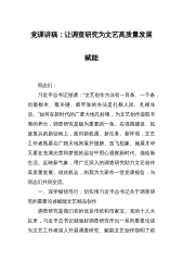 党课讲稿:学习贯彻习近平新时代中国特色社会主义思想、发扬斗争精神,大兴调查研究之风我们党始终高度重视调查研究,将调查研究确立为党的一项重要工作制度,推动调查研究广泛开展,深入调查研究解决发展难题。对于在全党大兴调查研究之风,真正把情况摸清、把问题找准、把对策提实,具有重要启示意义。面对新形势新挑战在调查研究中既要敢于斗争又要善于斗争。在事关中国特色社会主义前途命运的大是大非问题上坚定不移,在改革发展稳定工作中敢于碰硬,在全面从严治党上敢于动硬,在维护国家核心利益上敢于针锋相对。在全党大兴调查研究是学习贯彻习近平新时代中国特色社会主义思想主题教育的重要内容和鲜明特色。党中央关于在全党大兴调查研究...