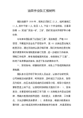 油田作业队汇报材料我队组建于1990年,现有正式职工22人,临时雇佣工11人,其中干部3人,党员4人,下设5个作业班组。主要承担着xx采油厂采油一矿、三矿、四矿的油水井维护和小修任务.今年来年我队展了以强化“三基”,落实制度,严格HSE管理,不断提升安全生产管理水平。第83次岗位责任制大检查活动,通过活动的认真仔细开展,我们对各岗位责任制展开调查和对各项制度的修订完善,进一步健全工作标准、理顺工作程序,将各项措施落到实处,全面强化了“三基",杜绝了各类事故的发生,促进了队伍的整体水平。一、宣传发动、积极组织安排,全队上下形成岗检的浓厚氛围.我队多次召开班子和大班人员会议,认真讨论研究局、公司岗...