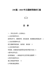 (68篇)2023年主题教育素材汇编(二)目录一、评论员文章(心得体会)1.人民日报评论员:把理论学习、调查研究、推动发展、检视整改贯通起来12.人民日报报评论员:把主题教育谋划好、组织好、落实好33.人民日报评论部:学思想,把握党的创新理论的世界观方法论54.新华社评论员:在有机融合、一体推进中扎实开展主题教育75.经济日报评论员:凝心铸魂筑牢根本96.中国纪检监察报:切实增强开展主题教育思想自觉政治自觉行动自觉117.东方烟草报评论员:凝聚奋进新征程的强大力量138.解放军报评论员:有机融合一体推进149.解放军报评论员:加强组织领导确保教育质量1610.解放军报评论员:学思想,深化理论武...