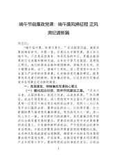在“端午”节前市人大办公室机关干部集体廉政谈话会上的讲话提纲同志们:端午佳节将至,在这粽香四溢、龙舟竞渡的传统节日前夕,我们齐聚一堂,开展此次集体廉政谈话,意义重大且深远。“端午临中夏,时清日复长。”端午节蕴含着深厚的文化内涵与廉洁基因,古人常以端午为契机,自省自律,弘扬清正之风。于我们而言,在此时强化廉政教育,是传承文化精神、筑牢廉洁防线的重要举措。市人大办公室作为人大常委会的综合办事机构,肩负着服务决策、协调各方、推动工作落实的重任。在新时代全面从严治党的背景下,加强办公室机关干部的廉政建设,是保障人大工作高质量发展、维护人大机关良好形象的必然要求。下面,我讲几点意见。一、以“清风拂柳”之...