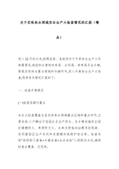 关于农牧林水领域安全生产大检查情况的汇报(精品)进入12月份以来,按照县委、县政府关于冬季安全生产工作部署要求,我组织分管的农牧局、水利局、林草局及各乡镇,聚焦农牧林水重点领域和关键环节,深入开展安全生产大检查,现将有关情况汇报如下:一、检查开展情况(一)检查范围与重点本次大检查覆盖全县农牧林水领域重点区域和重点环节,主要包括:三产融合示范园企业生产安全、各乡镇设施农业园区暖棚防火、草原防灭火、水库及侵蚀沟治理项目现场、食用菌园区生产车间和发菌棚加热锅炉安全等。检查采取"县级部门督查+乡镇自查+企业自检"三级联动方式,确保检查全覆盖、无死角。(二)检查组织实施一是周密部署安排。12月初召开农牧...