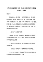 X市交通运输局党组书记、局长在2024年全市交通运输工作会议上的讲话同志们:这次会议的主要任务是:以习近平新时代中国特色社会主义思想为指导,全面落实部、省、市会议要求,总结2023年交通运输工作,部署2024年重点工作,统一思想、凝聚力量,动员全市交通系统奋力推进交通运输高质量发展,勇当建设社会主义现代化新X的开路先锋。下面,我报告两个方面的内容:一、2023年主要工作回顾2023年,在市委、市政府和上级交通部门坚强领导下,在各区县市和市直部门大力支持下,全市交通运输工作取得了来之不易的成绩。——我市获评2023年度省交通运输真抓实干督查激励考核一类。——打赢民生保障仗工作成绩被省政府通报表彰...