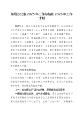 某局办公室2025年工作总结和2026年工作计划2025年,局办公室在局党组的坚强领导下,始终坚持以习近平新时代中国特色社会主义思想为指导,紧紧围绕全局中心工作,认真履行“承上启下、协调左右、服务保障”职能,以高度的政治自觉、饱满的精神状态、务实的工作作风,在政治理论学习、文稿服务、会务统筹、行政管理、督查督办以及机关建设等方面取得了显著成效,为全局各项工作的顺利开展提供了坚实保障。在肯定成绩的同时,我们清醒认识到工作中存在的不足和挑战。展望2026年,局办公室将牢牢把握新时代新使命新要求,锚定更高目标,以更优服务、更严标准、更实举措,全面提升办公室工作水平,为谱写本局事业发展新篇章贡献更大力...