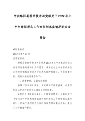 中共略阳县科学技术局党组关于2022年上半年意识形态工作责任制落实情况的自查报告略阳县政府2022年8月23日县委宣传部: 按照县委宣传部《关于开展2022年上半年意识形态工作专项督查的通知》文件要求,我局在对上半年意识形态工作责任制落实情况进行认真总结的基础上,开展自查分析,现将自查情况报告如下: 一、高度重视,全面安排部署 按照《责任书》要求,局党组班子高度重视,对意识形态工作及时召开会议进行了研究部署。 1.制定了《实施方案》。经局党组研究,认真制定了《略阳县科学技术局党组落实意识形态工作责任制实施方案》,明确了意识形态工作的指导思想和重点任务,提出了工作措施和要求。 2.落实...