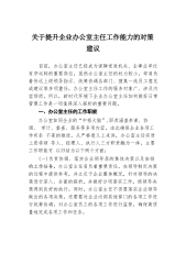 关于提升企业办公室主任工作能力的对策建议目前,办公室主任已经成为保障党政机关、企事业单位有序运转的重要岗位,虽然办公室主任的权力较小,却肩负着传达上级领导指示、统筹协调各部门、搜集一线员工意见或建议等多项重任,办公室主任工作的服务对象广、涉及内容烦琐,所以,新时代环境下企业办公室主任如何做好日常管理工作是一项值得深入探析的重要问题。一、办公室主任的工作职能办公室如同企业的“中枢大脑”,职责涵盖参谋、协调、审计、督查、服务等多项内容,由此确保企业各项工作有条不紊的推进。从严格意义上来讲,办公室主任实质上是将领导人、经理人、执行人三方职责融为一体,主要工作职能可以归结为以下两个方面:(一)负责协调...