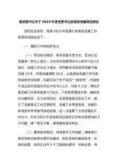 镇党委书记关于2023年度党委书记抓基层党建情况报告按照会议安排,现将2023年度履行抓基层党建工作职责情况报告如下:一、履职工作特色和亮点(一)突出政治建设,靠实党建主责主业。坚决扛起党建第一责任人责任,主持召开党委理论中心组学习会15场次,党建工作会议3场次,研究解决涉及基层党建方面问题13件,开展党建调研10次,认真落实党建工作约谈和述职评议制度,压紧压实了班子成员“一岗双责”,约谈班子成员及村党组织书记4轮63人次,问责4人次,带队开展党建工作督导检查12轮次,下发督查通报8期,确保责任分解到位、压力传导到位。高度重视意识形态工作,建立了党建重点工作定期研究、党建工作季度督查、党建目标...