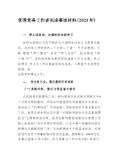 优秀党务工作者先进事迹材料(2023年)一、带头讲政治,注重抓好自我学习该同志坚持以习近平新时代中国特色社会主义思想为指导,深刻学习贯彻党的二十大和二十届一中全会精神,不断增强“四个意识",坚定“四个自信”,坚决做到“两个维护”,坚持把讲政治贯穿纪检监察工作全过程,努力将理论学习与工作实践紧密结合起来,不断提升自身党性觉悟、政治素质和理论水平。二、突出抓主业,强化履职尽责成效(一)多措并举,强化日常监督不缺位扎实推进巡察整改工作,按时高效完成巡察反馈意见中*个方面问题的整改,采取各种措施促进巡察整改任务落实;督促成立“扫黑除恶”专项督查工作组并组织开展自查自纠工作,指导各党支部扎实开展“扫黑除...