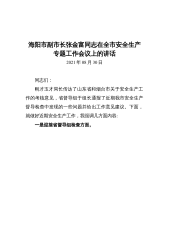 海阳市副市长张金富同志在全市安全生产专题工作会议上的讲话2021年08月30日同志们:刚才玉才局长传达了山东省和烟台市关于安全生产工作的考核意见,省督导组于组长通报了近期我市安全生产督导检查中发现的一些问题并给出工作意见建议。下面,就做好近期安全生产工作,我强调几方面内容:一是迎接省督导组检查方面,从于组长通报的在我市安全生产督导检查中发现的问题隐患以及近期上级通报的我市各领域安全生产工作问题来看,近段时间以来,我市的安全生产工作是有所懈怠的这种苗头千万不能出现,必须趁早遏制。虽然近期疫情防控、环保督查等工作牵扯大家精力较大,但安全生产工作没有万一,必须从一而终的做到坚持再坚持,否则,我们所做...