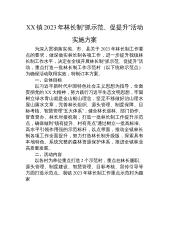 XX镇2023年林长制“抓示范、促提升”活动实施方案为深入贯彻落实省、市、县关于2023年林长制工作要点的要求,做深做实林长制各项工作,进一步提升我镇林长制工作水平,决定在全镇开展林长制“抓示范、促提升”活动,重点打造一批林长制工作示范村(以下统称示范点)为确保活动取得实效,特制订本方案。一、总体目标以习近平新时代中国特色社会主义思想为指导,全面贯彻党的XX大精神,努力践行习近平生态文明思想,牢固树立绿水青山就是金山银山理念,坚定不移做好治山理水显山露水文章,完善林长组织、源头管理、制度保障、目标考核、智慧管理“五大体系”,健全林长巡林、部门协作、督查督办、林长对接机制,打造一批林长制工作提升...